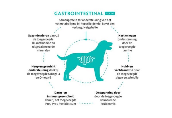 Volledige dieetvoeding voor honden, speciaal ontwikkeld ter ondersteuning van het lipidenmetabolisme bij hyperlipidemie (verhoogde vetwaarden in het bloed). Deze voeding op basis van zorgvuldig ontbeend kalkoenvlees bevat licht verteerbare ingrediënten, een antioxidantcomplex en pre-, pro- en postbiotica voor optimale bescherming van het spijsverteringsstelsel. Dankzij het lage vetgehalte helpt deze formule de spijsvertering te verbeteren bij honden met hyperlipidemie of acute pancreatitis.